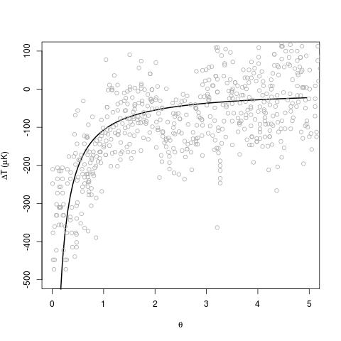 Figure 4: The predicted temperature deviations, T, of the cold spot (bold line). Observation data (gray circles) taken from Gurzadyan et al. [2014]. For more information on parameter values and derivations, see full VLS manuscript.
