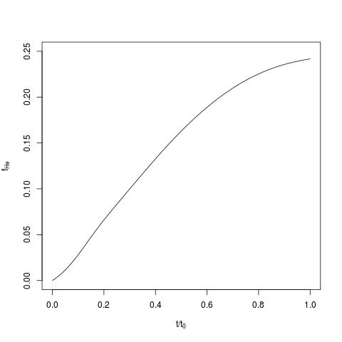 Evaluation of the output from numerical simulations reveals a present-day helium energy fraction between about 22-27% for the Milky Way galaxy, in good overall agreement with the aforementioned observation data. A typical simulation output is shown in the above figure (for more details on parameter setting see full manuscript). As shown, the helium energy fractions are found to exhibit a nearly sigmoid type distribution with respect to time, with values starting at 0 at t=0 and approaching a value of about 25% at time , with the inflection point occurring around t/~0.4 coinciding with He fractions near 12-13%.