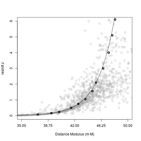 Figure 1: A comparision of redshift Z versus distance modulus (m-M) data and model predictions. Solid line represents the variable light speed model output. Gray circles represent data from Risaliti et Lusso [2015] (quasars) and Suzuki et al. [2012] (supernovae). Bold circles are the frequency-bin averaged quasar data of Bisogni et al. [2018].